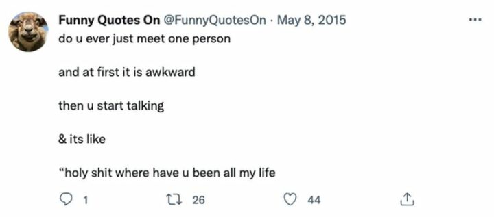 ![29 Funny Twitter Quotes - "Do u ever just meet one person and at first it is awkward then u start talking and it's like 'Holy [censored] where have u been all my life.'"](https://www.winkgo.com/wp-content/uploads/2022/05/funny-tweets-06-720x317.jpg)