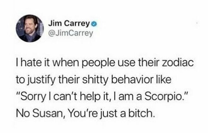 9) “I hate it when people use their zodiac to justify their [censored] behavior like ‘Sorry I can’t help it, I am a Scorpio‘. No Susan, you’re just a [censored].”