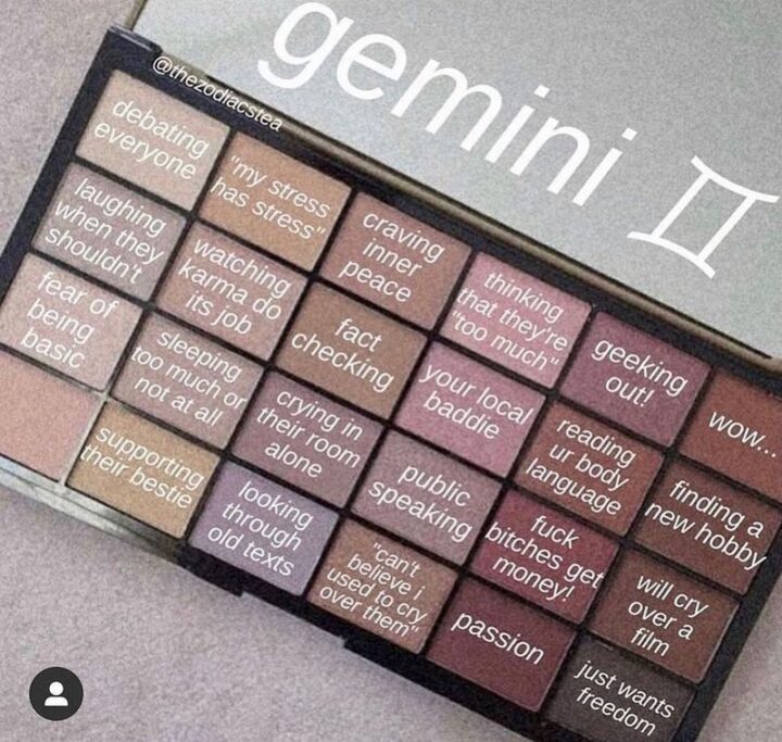 Gemini: Debating everyone. My stress has stress. Craving inner peace. Thinking that they’re too much. Geeking out! Wow…Laughing when they shouldn’t. Watching karma do its job. Fact-checking. Your local baddie. Reading ur body language. Finding a new hobby. Fear of being basic. Sleeping too much or not at all. Crying in their room alone. Public speaking. [censored] get money! I will cry over a film. Supporting their bestie. Looking through old texts. Can’t believe I used to cry over them. Passion. Just wants freedom.”