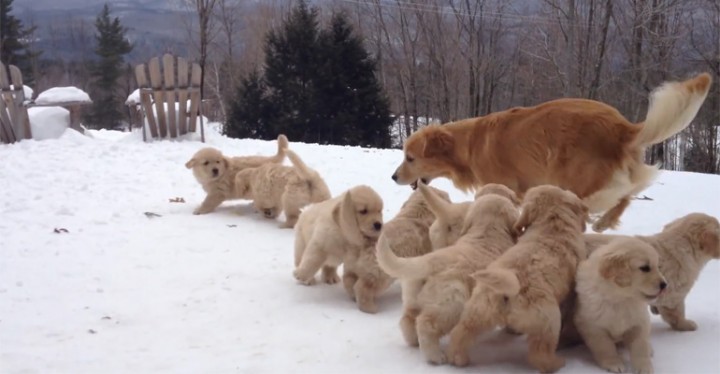 Those are nine little pups that are going to grow up happy and strong. Please share these Golden Retriever puppies playing in the snow with their mom with your friends and family.