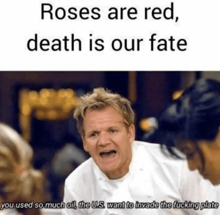 !["Roses are red, death is our fate, you used so much oil, the U.S. wants to invade the [censored] plate."](https://www.winkgo.com/wp-content/uploads/2022/07/gordon-ramsay-memes-26-720x702.jpg)