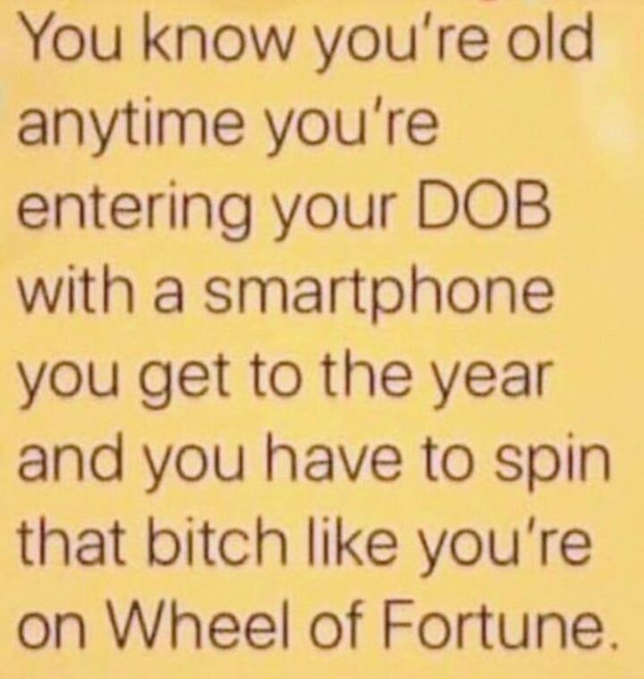!["You know you're old anytime you're entering your date of birth with a smartphone you get to the year and you have to spin that [censored] like you're on Wheel of Fortune."](https://www.winkgo.com/wp-content/uploads/2023/01/funny-60th-birthday-memes-40-720x759.jpg)