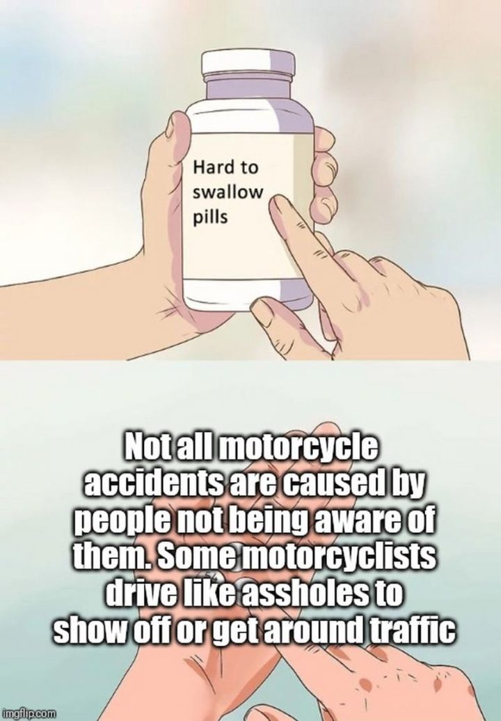 ![61 "Hard to Swallow Pills" Memes - "Not all motorcycle accidents are caused by people not being aware of them. Some motorcyclists drive like [censored] to show off or get around traffic."](https://www.winkgo.com/wp-content/uploads/2020/09/hard-pill-to-swallow-memes-02-720x1035.jpg)