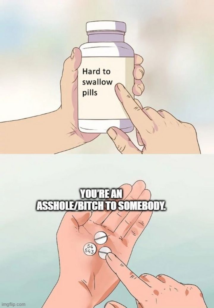 !["You’re an [censored] to somebody."](https://www.winkgo.com/wp-content/uploads/2020/09/hard-pill-to-swallow-memes-60-720x1035.jpg)