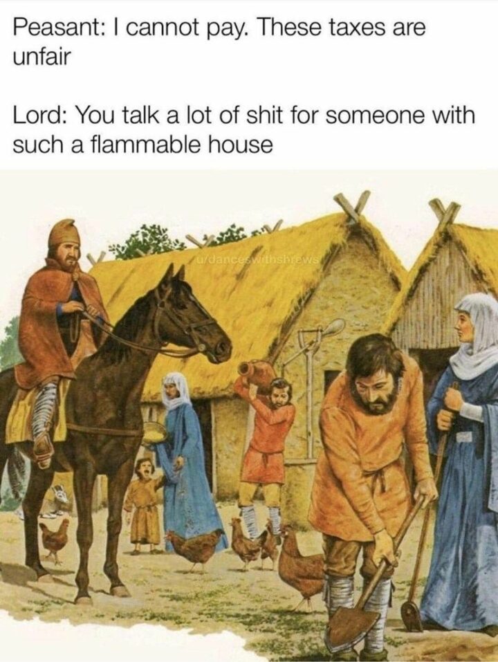 "Peasant: I cannot pay. These taxes are unfair. Lord: You talk a lot of [censored] for someone with such a flammable house."