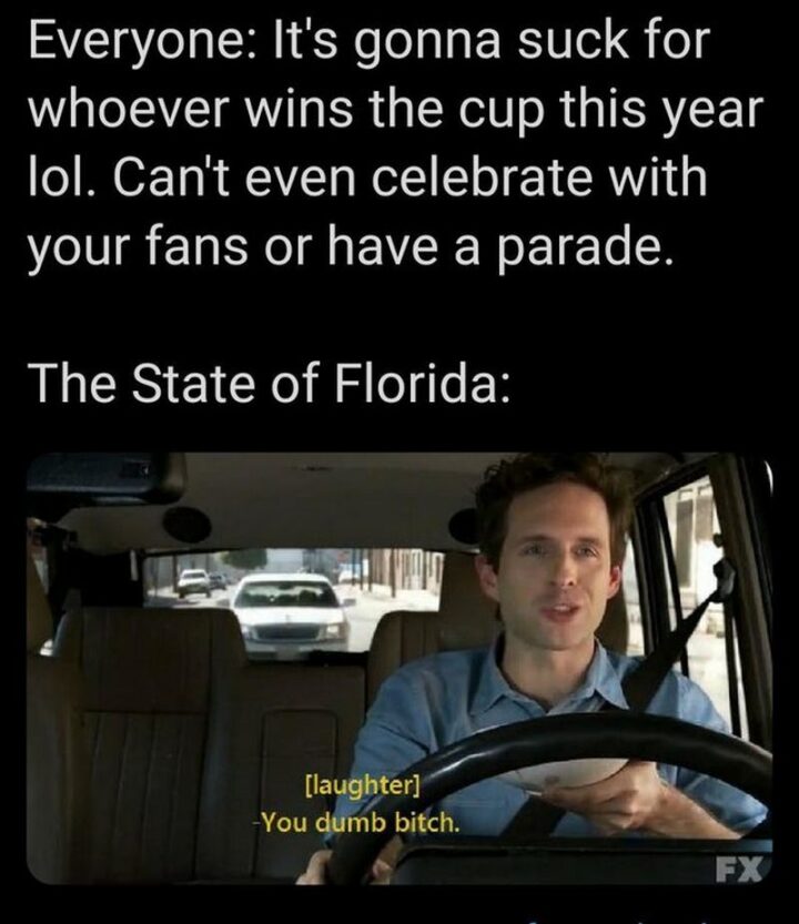 “Everyone: It’s gonna suck for whoever wins the cup this year, lol. You can’t even celebrate with your fans or have a parade. The state of Florida: [laughter] You dumb [censored].”