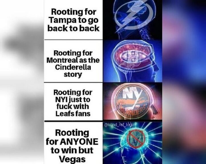 !["Rooting for Tampa Bay Lightning to go back to back. Rooting for the Montreal Canadiens as the Cinderella story. Rooting for the New York Islanders just to [censored] with Toronto Maple Leafs fans. Rooting for ANYONE to win but Vegas Golden Knights.](https://www.winkgo.com/wp-content/uploads/2021/06/hockey-memes-47-720x576.jpg)