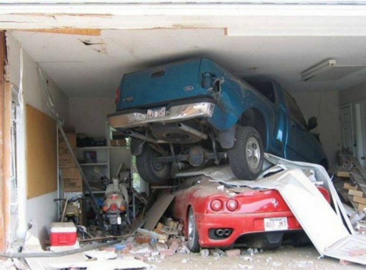 I was coming home from Walmart, and when I turned into the driveway I accidentally pushed down on the accelerator instead of the brake. The garage door is slightly bent but the pickup, fortunately, came to a halt when it bumped into your car.