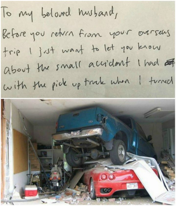 “To my beloved husband,Before you return from your overseas trip I just want to let you know about the small accident I had with the pickup truck when I turned into the driveway. Fortunately not too bad and I really didn’t get hurt, so please don’t worry too much about me.