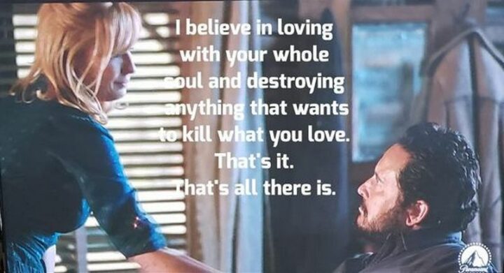 9) “I believe in loving with your whole soul and destroying and destroying anything that wants to kill what you love. That’s it. That’s all there is.” – Beth Dutton, Yellowstone