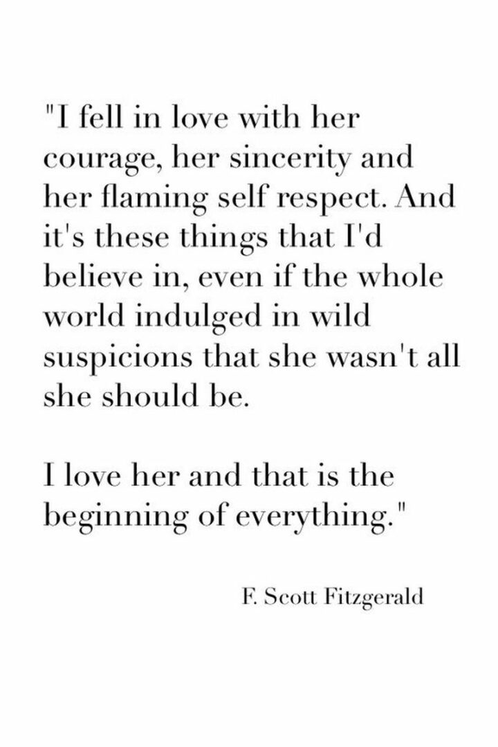 13) “I fell in love with her courage, her sincerity, and her flaming self-respect. And it’s these things I’d believe in, even if the whole world indulged in wild suspicions that she wasn’t all she should be. I love her and it is the beginning of everything.” – F. Scott Fitzgerald