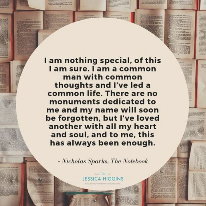 30) “There are no monuments dedicated to me and my name will soon be forgotten, but I’ve loved another with all my heart and soul, and to me, this has always been enough.” – Nicholas Sparks, The Notebook