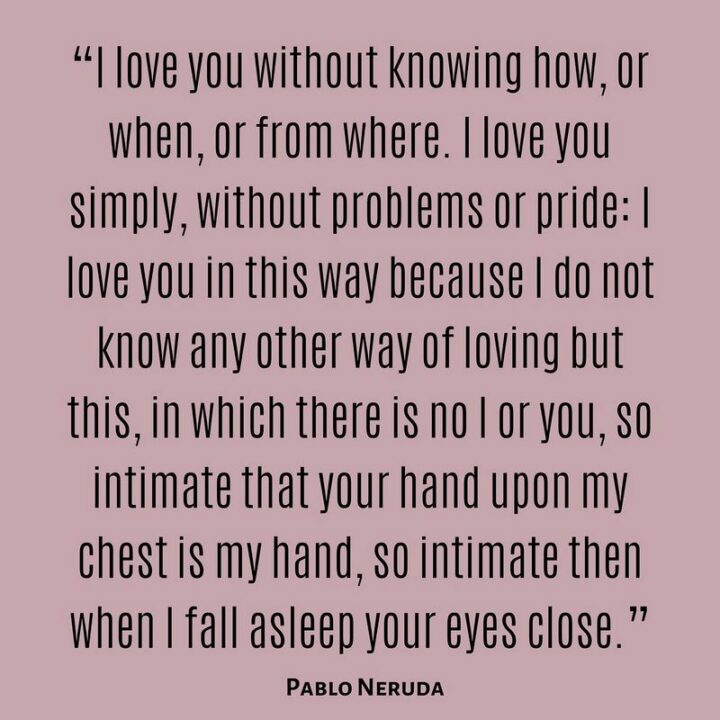 35) “I love you without knowing how, or when, or from where. I love you simply, without problems or pride: I love you in this way because I do not know any other way of loving but this, in which there is no I or you, so intimate that your hand upon my chest is my hand, so intimate that when I fall asleep your eyes close.” – Pablo Neruda