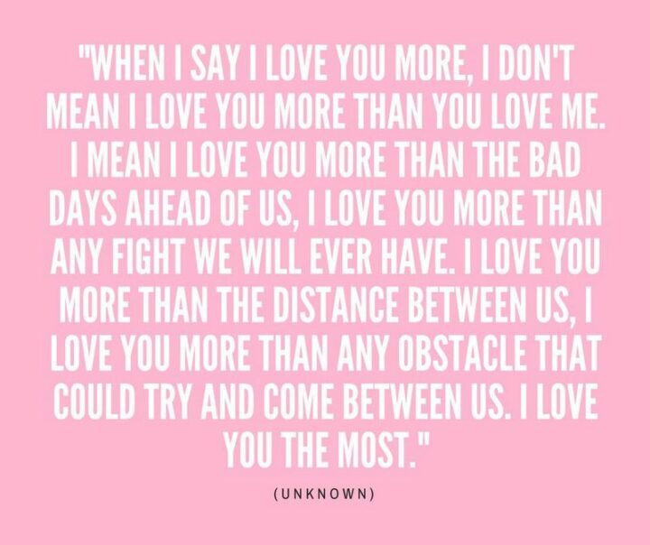 47) “When I say I love you more, I don’t mean I love you more than you love me. I mean I love you more than the bad days ahead of us, I love you more than any fight we will ever have. I love you more than the distance between us, I love you more than any obstacle that could try and come between us. I love you the most.” – Unknown