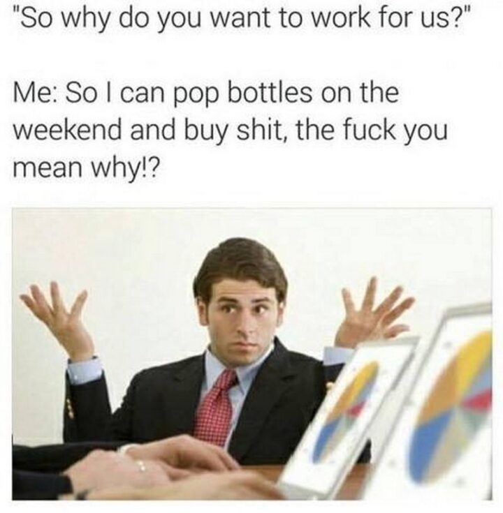 !["Them: So why do you want to work for us? Me: So I can pop bottles on the weekend and buy [censored], the [censored] you mean why!?"](https://www.winkgo.com/wp-content/uploads/2021/10/inappropriate-memes-48-720x735.jpg)