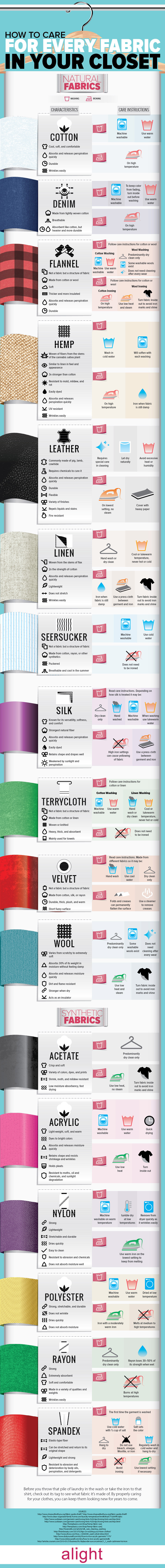 This handy infographic from Alight in partnership with Ghergich & Co. offers information and care instructions for every type of fabric you can think of. Understanding how to care for the fabrics in your closet will make sorting clothes much easier and extend the life of your clothes.