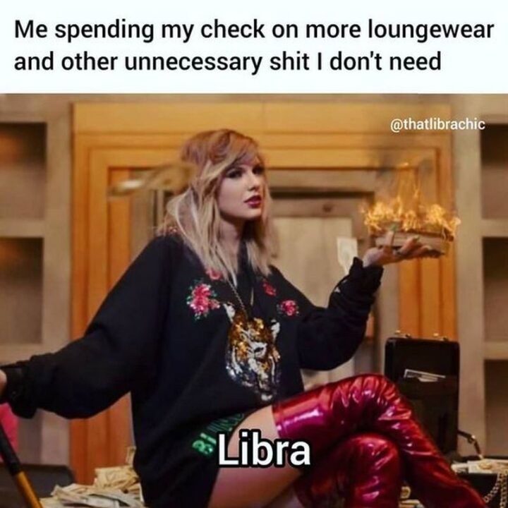 !["Me spending my check on more loungewear and other unnecessary [censored] I don't need. Libra."](https://www.winkgo.com/wp-content/uploads/2022/01/libra-zodiac-memes-29-720x720.jpg)