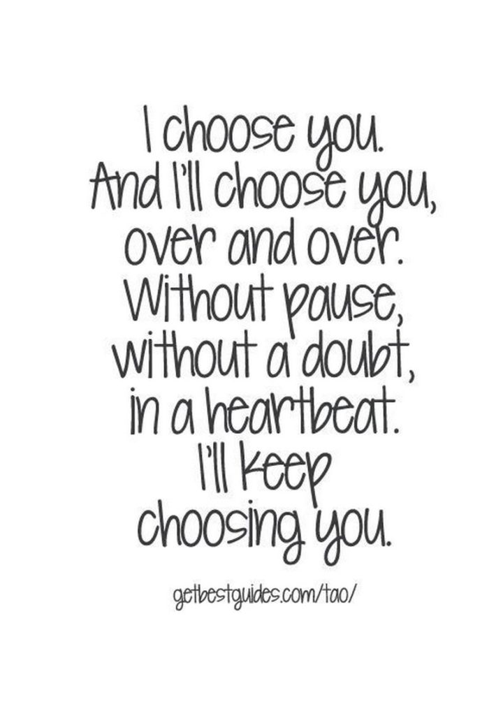 Love quotes for her: “I choose you. And I’ll choose you, over and over. Without pause, without a doubt, in a heartbeat. I’ll keep choosing you.” – Anonymous