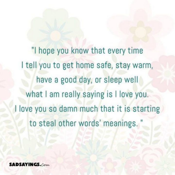 “I hope you know that every time I tell you to get home safe, stay warm, have a good day, or sleep well what I am really saying is I love you. I love you so damn much that it is starting to steal other words’ meanings.” – Anonymous