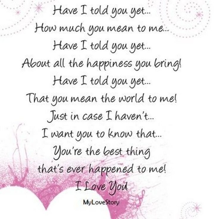 “Have I told you yet…How much you mean to me…Have I told you yet…About all the happiness you bring! Have I told you yet…That you mean the world to me! Just in case I haven’t…I want you to know that…You’re the best thing that’s ever happened to me! I love you.” – Anonymous