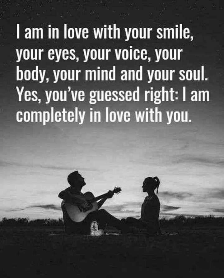 “I am in love with your smile, your eyes, your voice, your body, your mind, and your soul. Yes, You’ve guessed right: I am completely in love with you.” – Anonymous