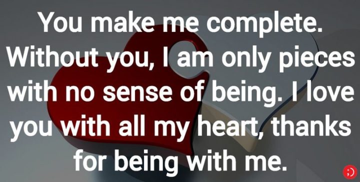 “You make me complete. Without you, I am only pieces with no sense of being. I love you with all my heart, thanks for being with me.” – Anonymous