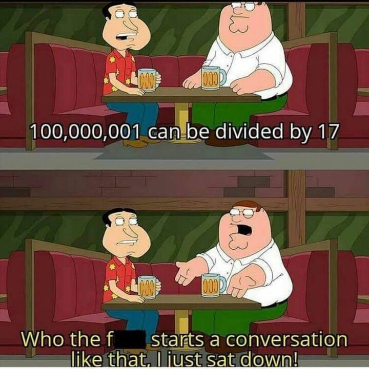 “100,000,001 can be divided by 17. Who the [censored] starts a conversation like that, I just sat down!”