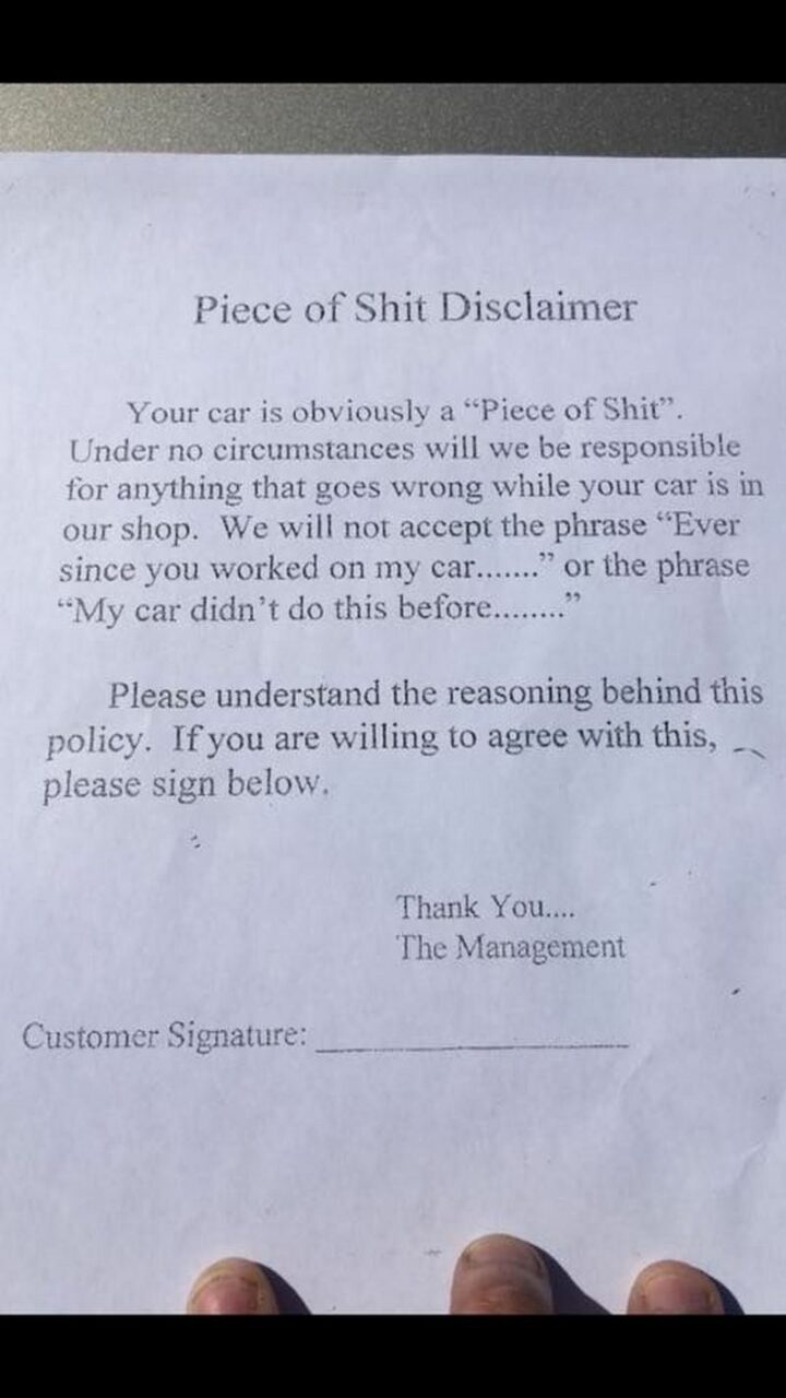 “Piece of [censored] Disclaimer: Your car is obviously a ‘Piece of [censored].’ Under no circumstances will we be responsible for anything that goes wrong while your car is in our shop. We will not accept the phrase ‘Ever since you worked on my car…’ or the phrase ‘My car didn’t do this before…’ Please understand the reasoning behind this policy. If you are willing to agree with this, please sign below. Thank you…The Management.”