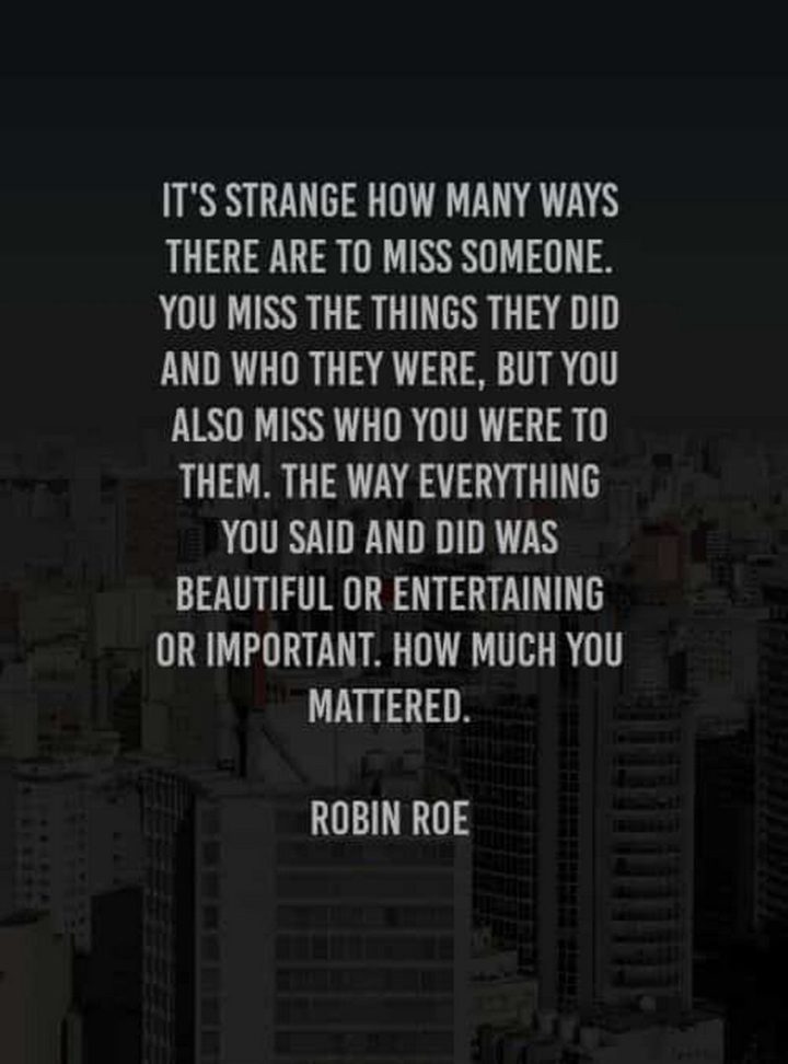 “It’s strange how many ways there are to miss someone. You miss the things they did and who they were, but you also miss who you were to them. The way everything you said and did was beautiful or entertaining or important. How much you mattered.” – Robin Roe