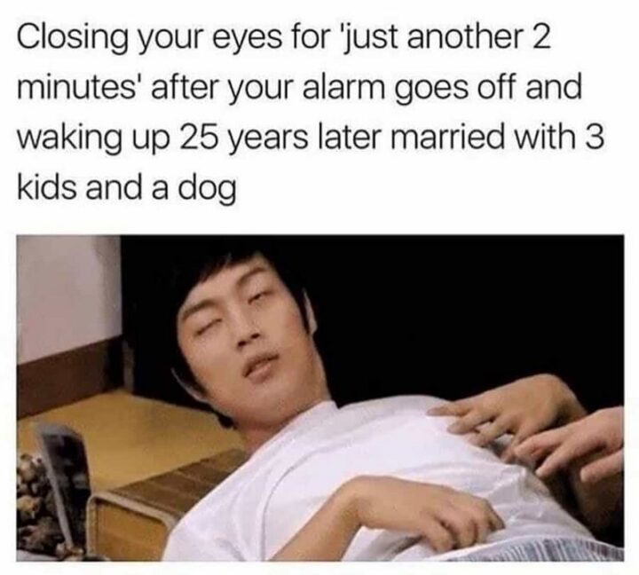 “Closing your eyes for “just another 2 minutes” after your alarm goes off and waking up 25 years later married with 3 kids and a dog.”