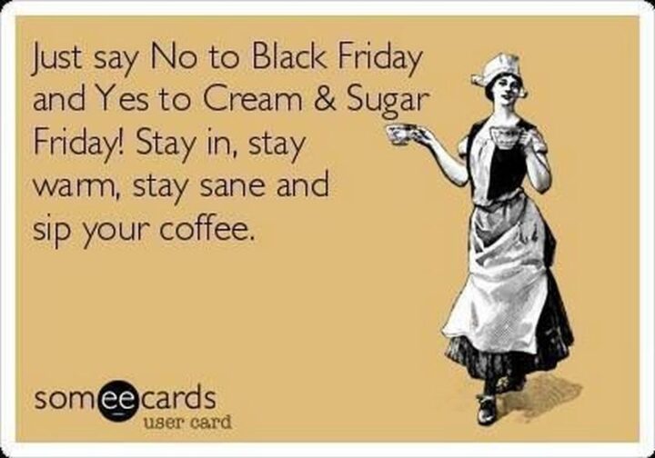 “Just say no to Black Friday and yes to Cream & Sugar Friday! Stay in, stay warm, stay sane and sip your coffee.”
