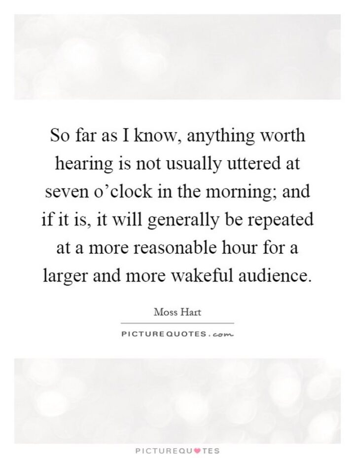 “So far as I know, anything worth hearing is not usually uttered at seven o’clock in the morning; and if it is, it will generally be repeated at a more reasonable hour for a larger and more wakeful audience.” – Moss Hart