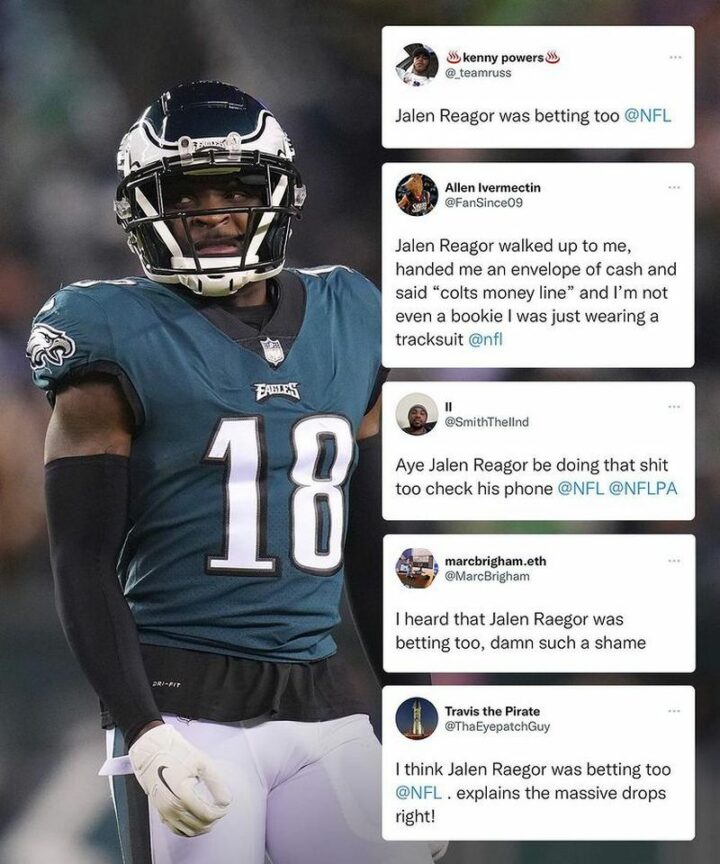“Jalen Reagor was betting too. Jalen Reagor walked up to me, handed me an envelope of cash, and said “Colts money line” and I’m not even a bookie. I was just wearing a tracksuit. Aye Jalen Reagor is doing that [censored] to check his phone. I heard that Jalen Reagor was betting too, damn such a shame. I think Jalen Reagor was betting too. Explains the massive drops right!”