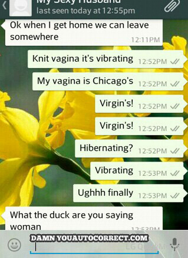 “Ok, when I get home we can leave somewhere. Knit [censored] it’s vibrating. My [censored] is Chicago’s. Virgin’s! Virgin’s! Hibernating? Vibrating. Ughhh finally. What the duck are you saying, woman?”