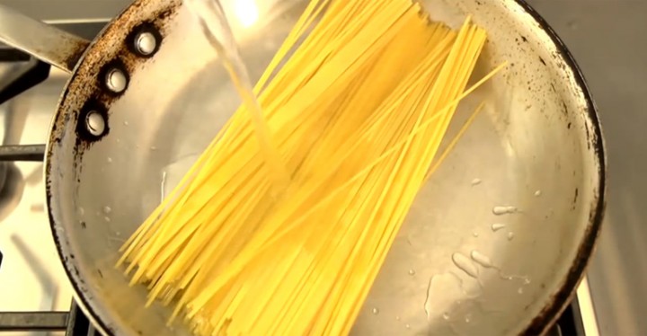 Harold McGee, author of Keys to Good Cooking: A Guide to Making the Best of Foods and Recipes (Available on Amazon), demonstrates how he cooks pasta in a frying pan with only enough cold water to cover the pasta. Also, because the pasta sits in cold water while it waits to boil, this prevents the noodles from sticking together.