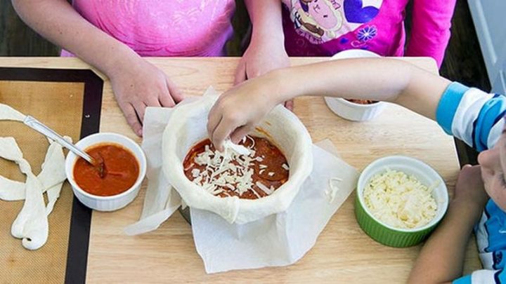 Here comes the fun part so ask your kids to help. Spread a little pizza sauce over the bottom layer, followed by some pepperoni, and finally some shredded mozzarella cheese.