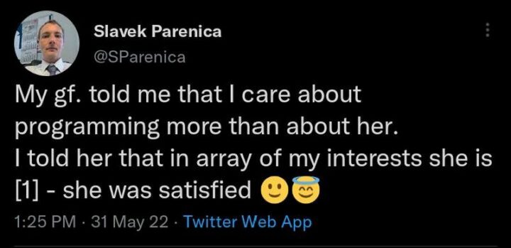 “My girlfriend told me that I care about programming more than about her. I told her that in an array of my interests, she is [1] – she was satisfied.”