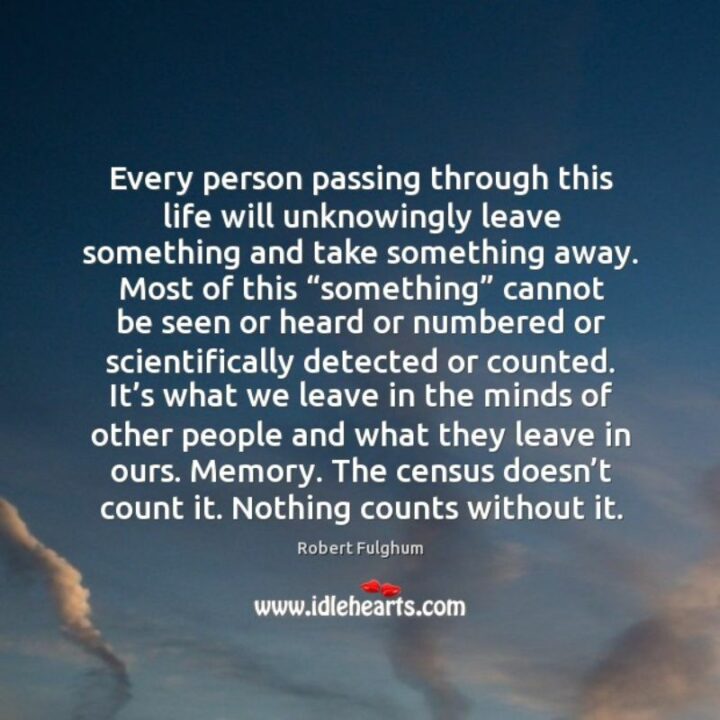 5) “Every person passing through this life will unknowingly leave something and take something away. Most of this “something” cannot be seen or heard or numbered or scientifically detected or counted. It’s what we leave in the minds of other people and what they leave in ours. Memory. The census doesn’t count it. Nothing counts without it.”