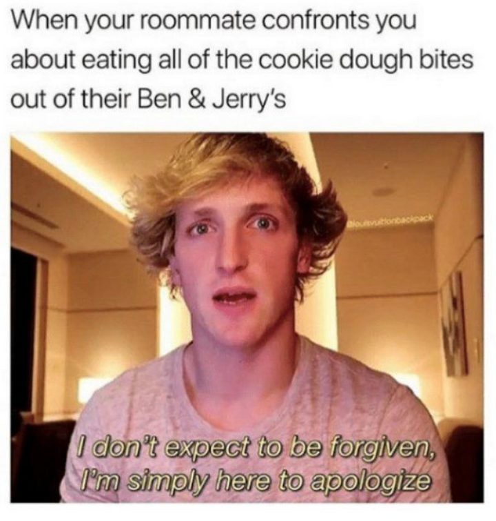 “When your roommate confronts you about eating all the cookie dough bites out of their Ben & Jerry’s: I don’t expect to be forgiven, I’m simply here to apologize.”