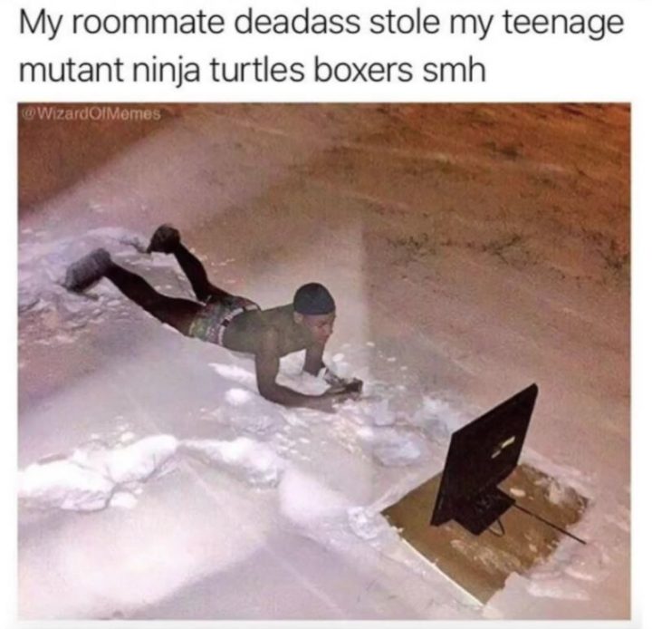 “My roommate deadass stole my teenage mutant ninja turtles boxers. Shaking my head.”
