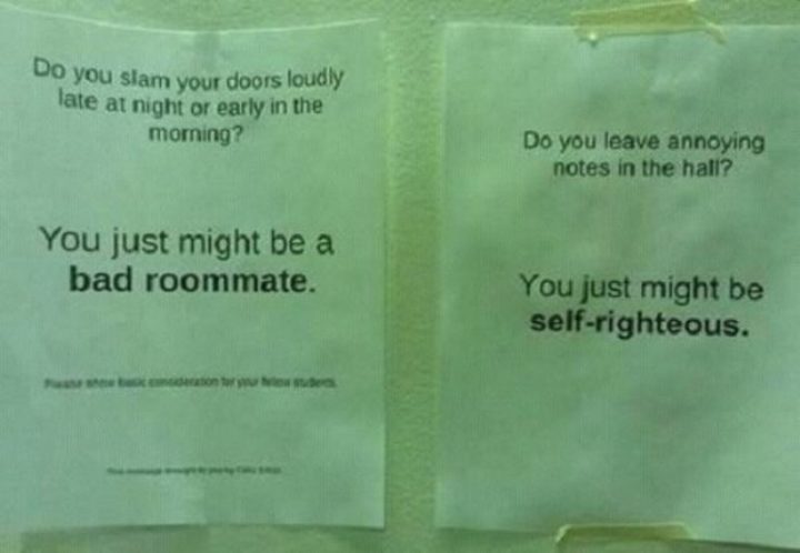 “Do you slam your doors loudly late at night or early in the morning? You just might be a bad roommate. Do you leave annoying notes in the hall? You just might be self-righteous.”