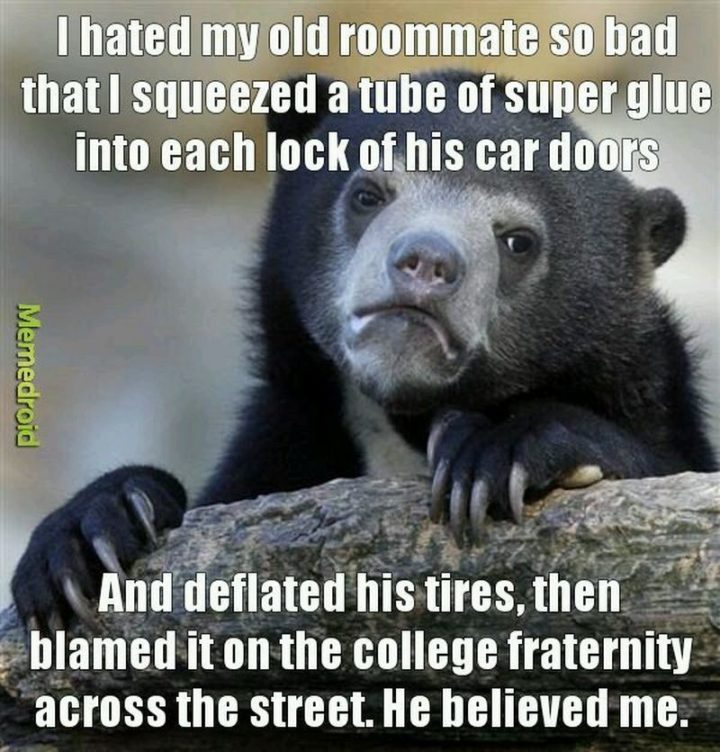 “I hated my old roommate so bad that I squeezed a tube of superglue into each lock of his car doors and deflated his tires, then blamed it on the college fraternity across the street. He believed me.”
