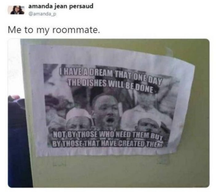 “Me to my roommate: I have a dream that one day the dishes will be done. Not by those who need them but by those that have created them.”