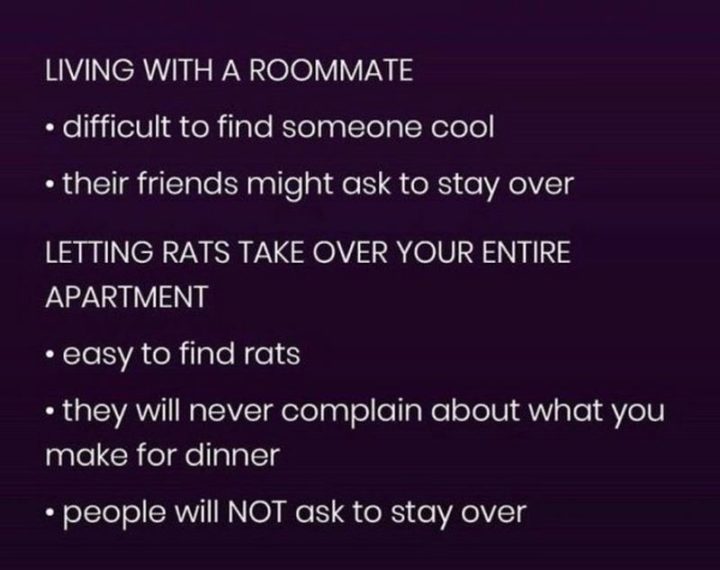 “Living with a roommate. Difficult to find someone cool. Their friends might ask to stay over. Letting rats take over your entire apartment. Easy to find rats. They will never complain about what you make for dinner. People will NOT ask to stay over.”