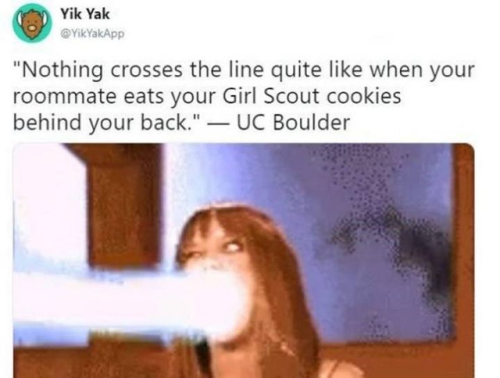 “Nothing crosses the line quite like when your roommate eats your Girl Scout cookies behind your back.”