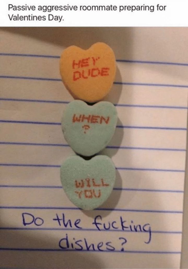 “Passive-aggressive roommate preparing for Valentine’s Day: Hey dude, when will you do the [censored] dishes?”