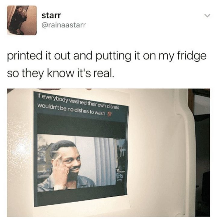 “Printed it out and putting it on my fridge so they know it’s real: If everybody washed their own dishes wouldn’t be dishes to wash.”
