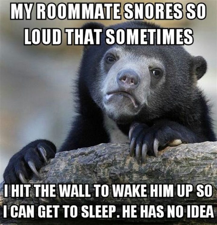 “My roommate snores so loud that sometimes I hit the wall to wake him up so I can get some sleep. He has no idea.”
