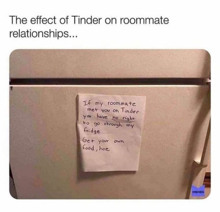 “The effect of Tinder on roommate relationships…If my roommate met you on Tinder, you have no right to go through my fridge. Get your own food, hoe.”