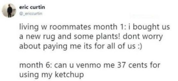 “Living w roommates month 1: I bought myself a new rug and some plants! Don’t worry about paying me it’s for all of us :). Month 6: Can u Venmo me 37 cents for using my ketchup.”
